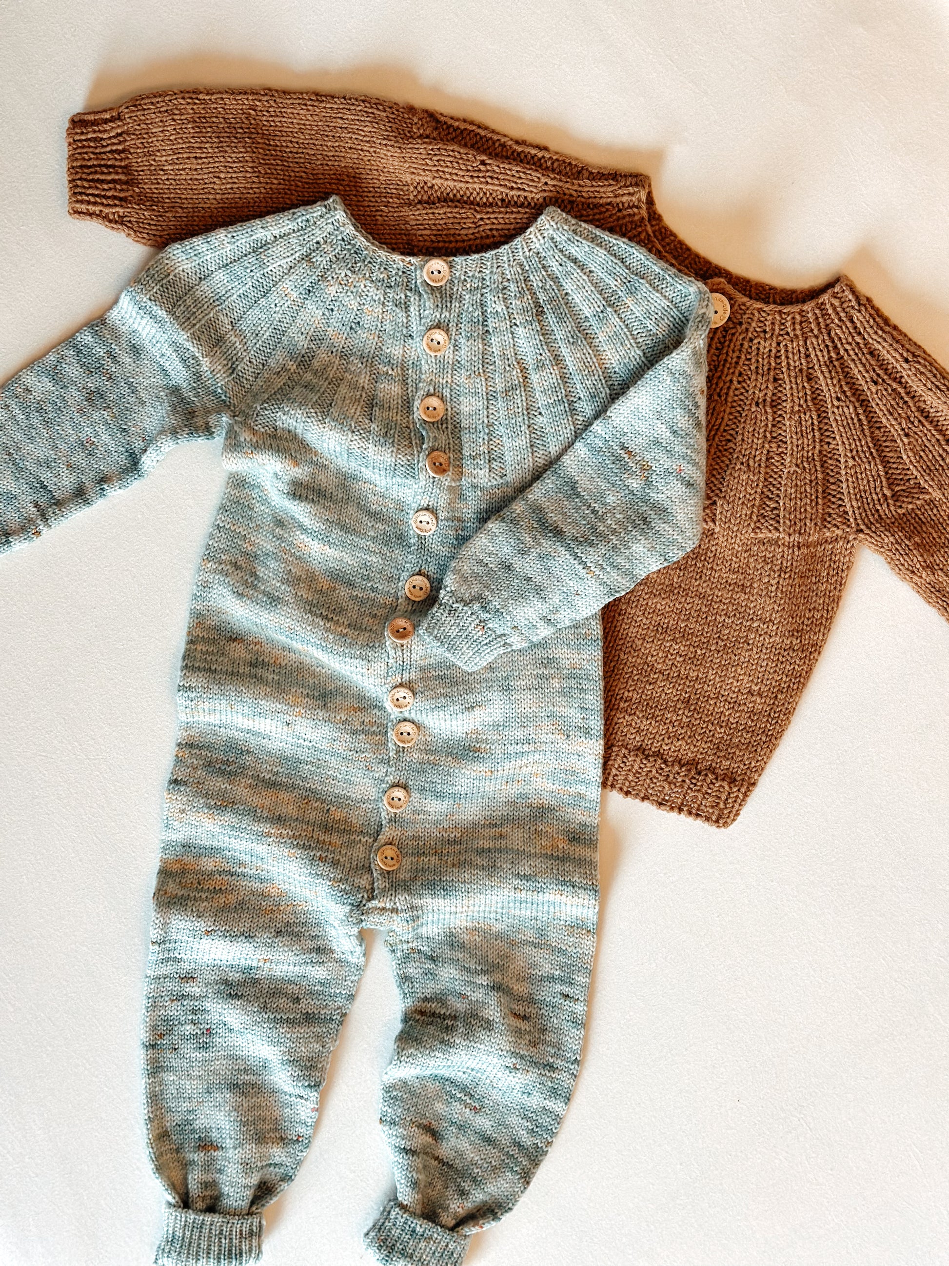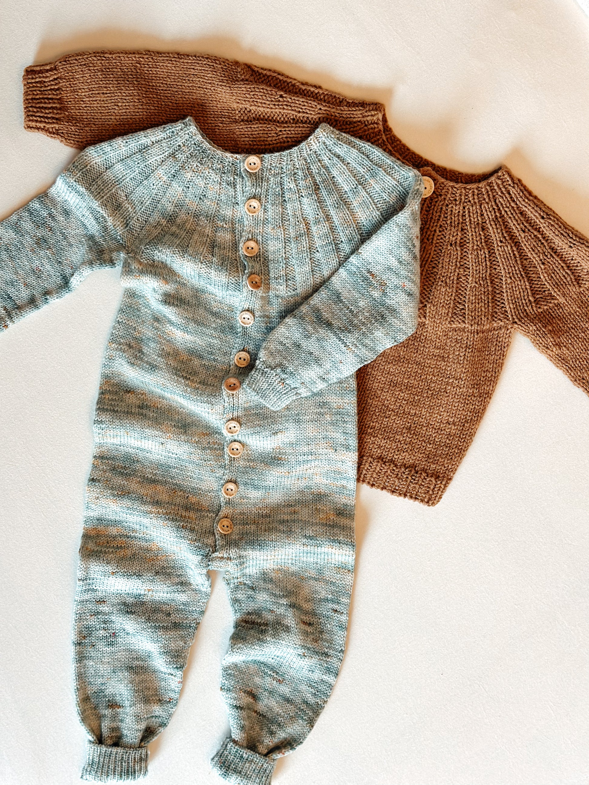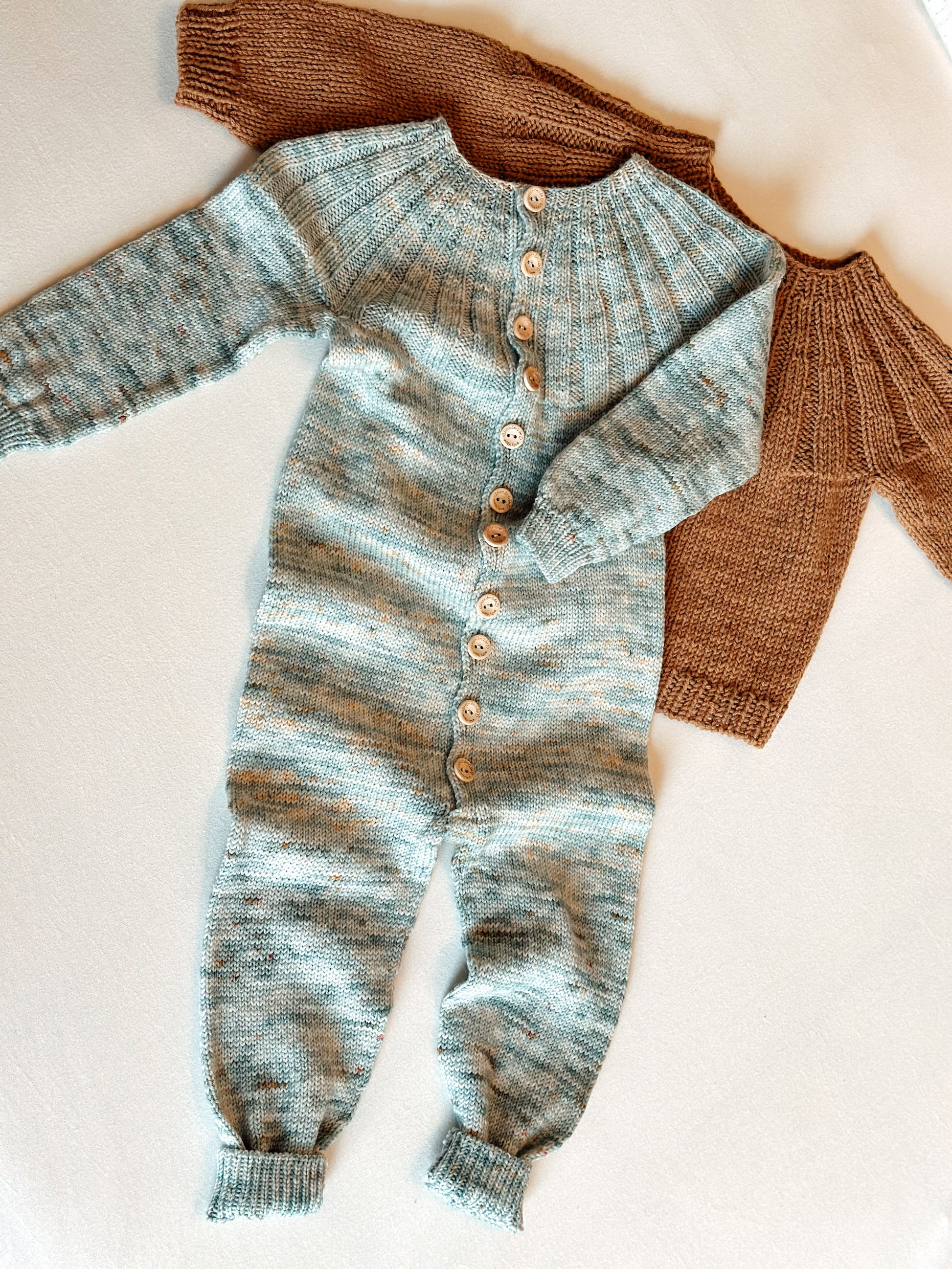 Dieses handgestrickte Set aus Jacke und Overall vereint Stil, Komfort und Langlebigkeit. Der Overall besteht aus einer hochwertigen Mischung aus Merino, Kaschmir und Nylon, die ihm eine außergewöhnliche Weichheit und Haltbarkeit verleiht. Die sanften Blau- und Carameltöne wurden in Dänemark handgefärbt und verleihen dem Set eine frische, aber gleichzeitig beruhigende Ausstrahlung.