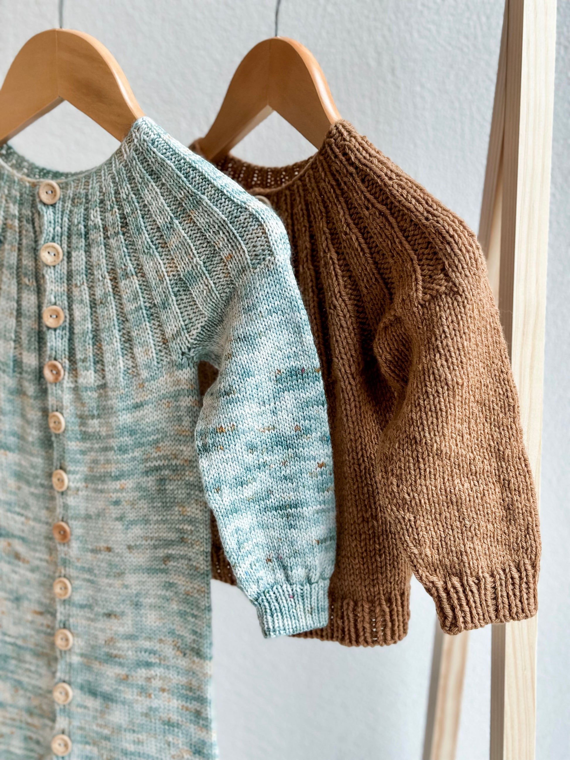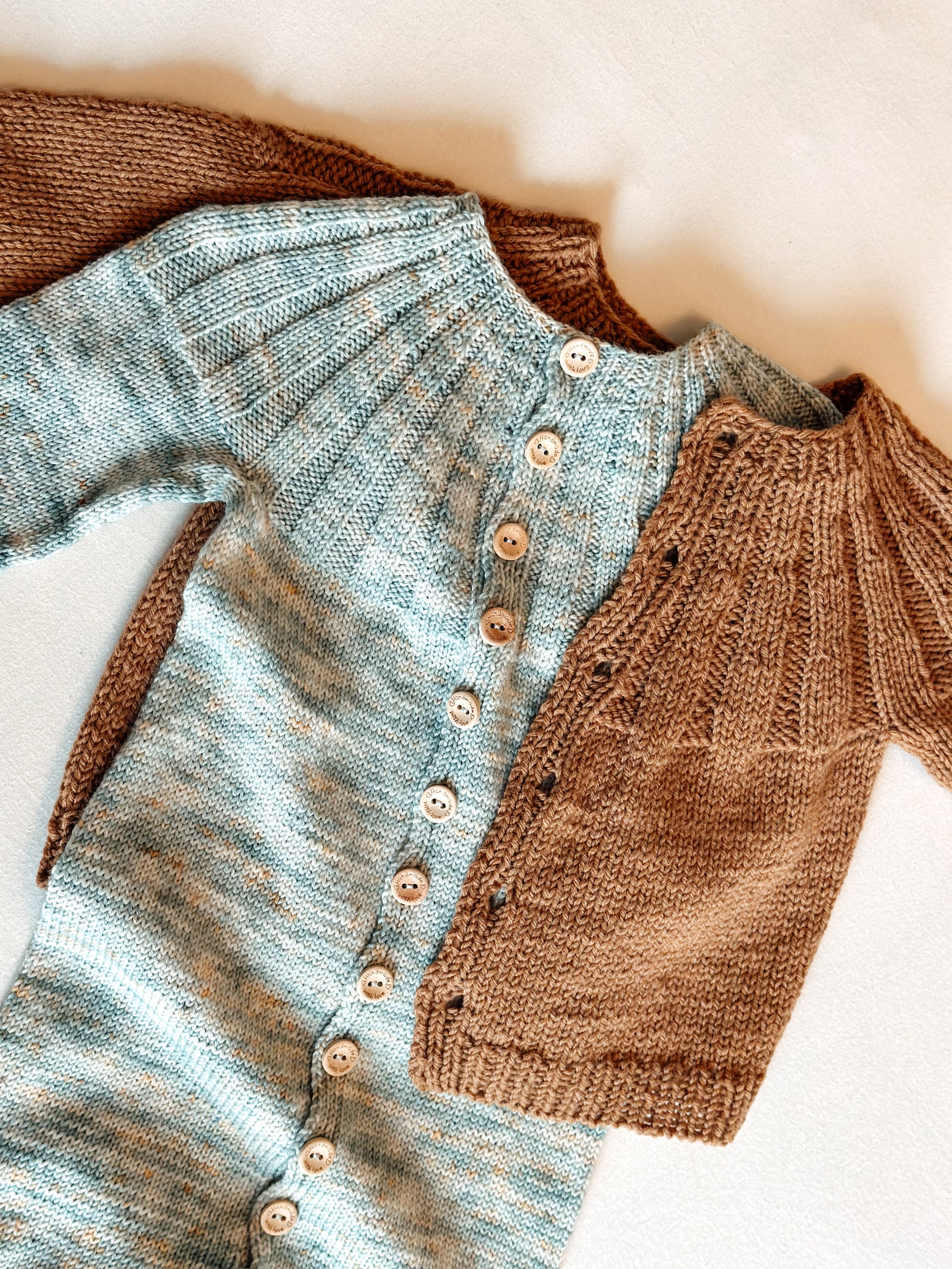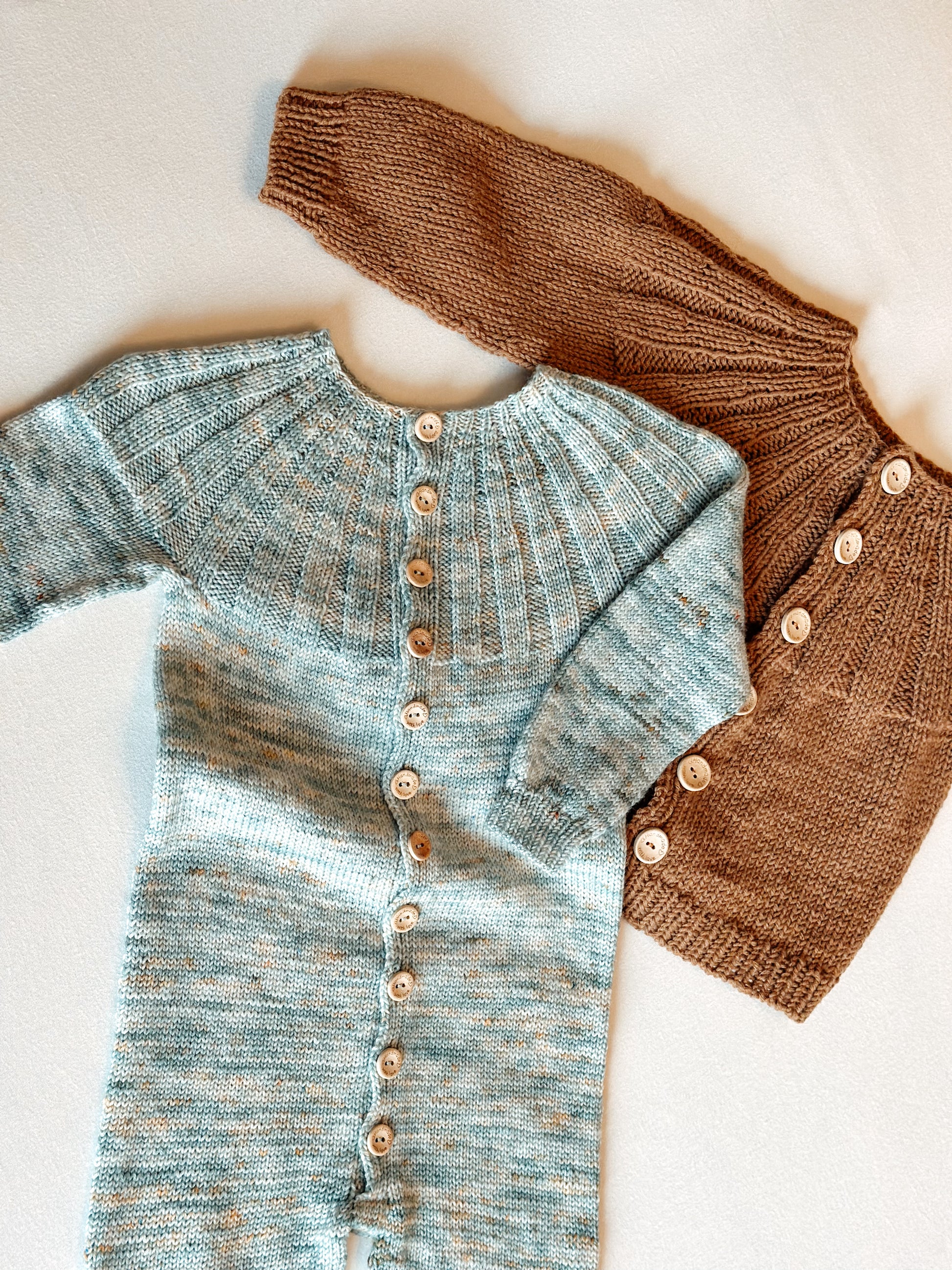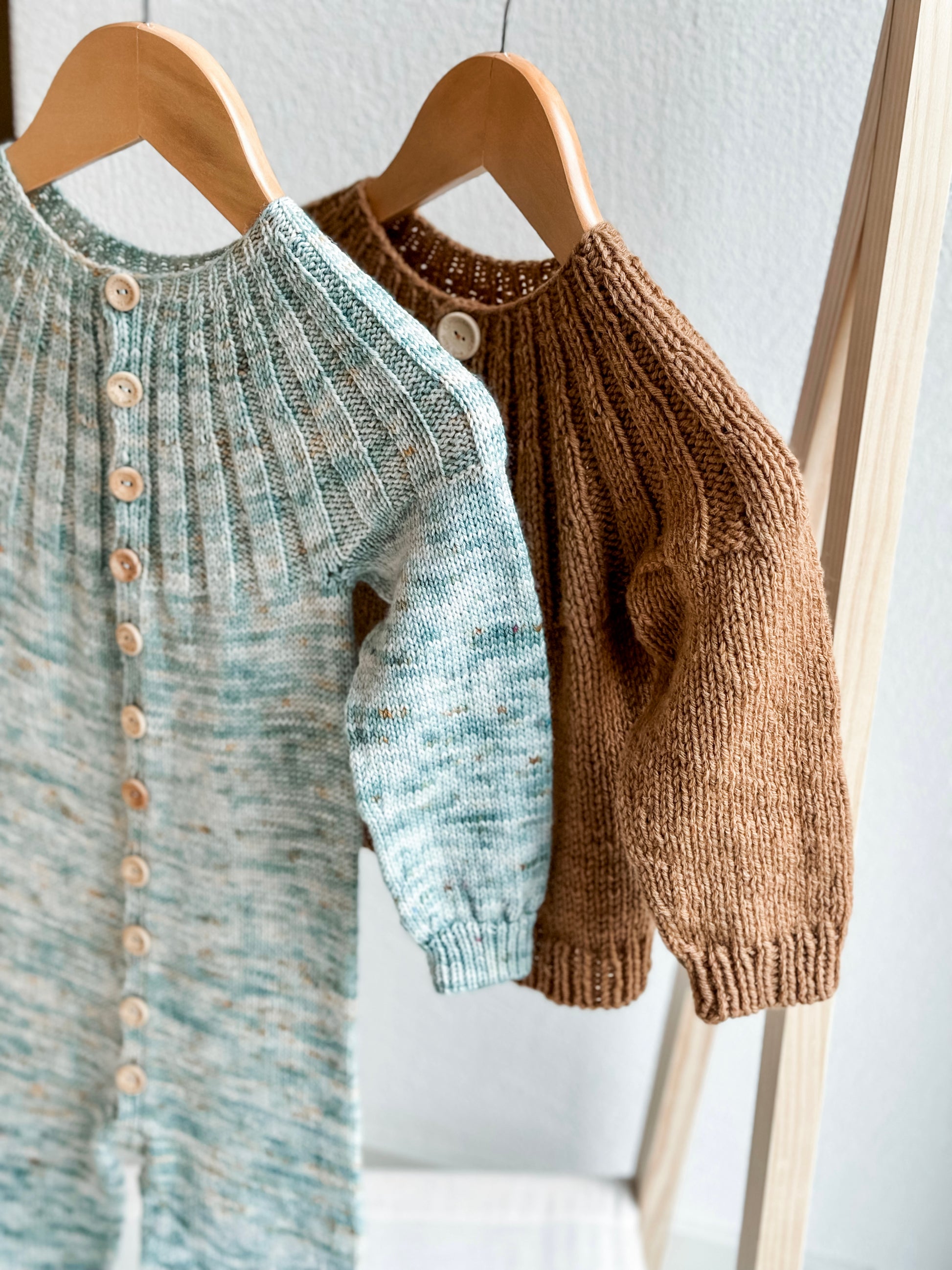 Dieses handgestrickte Set aus Jacke und Overall vereint Stil, Komfort und Langlebigkeit. Der Overall besteht aus einer hochwertigen Mischung aus Merino, Kaschmir und Nylon, die ihm eine außergewöhnliche Weichheit und Haltbarkeit verleiht. Die sanften Blau- und Carameltöne wurden in Dänemark handgefärbt und verleihen dem Set eine frische, aber gleichzeitig beruhigende Ausstrahlung.