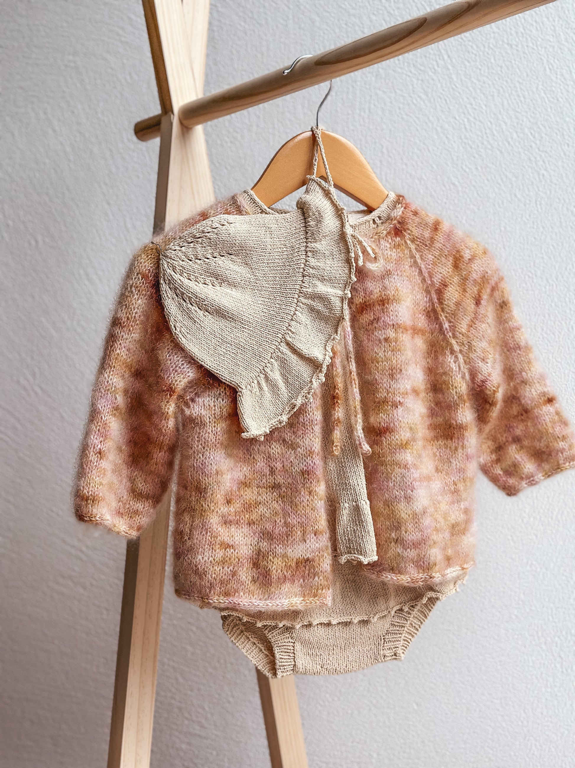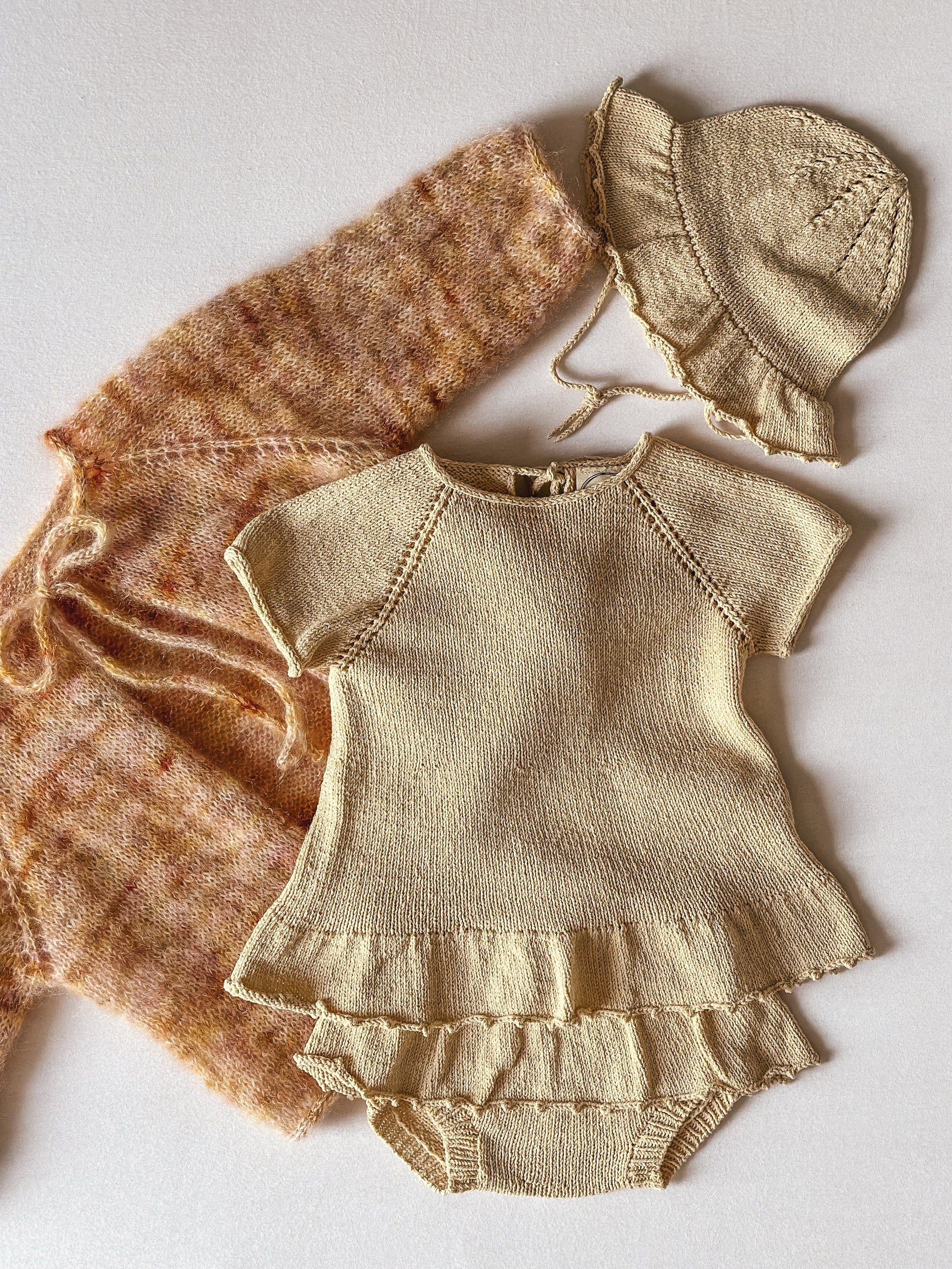 Dieses handgestrickte Set aus einer Kombi und der passenden Jacke wird dich begeistern! Die 100% Seide Kombi in zartem Blassgelb mit verspielten Rüschen ist nicht nur wunderschön, sondern auch angenehm auf der Haut. Die 70% Mohair und 30% Seide Jacke ist flauschig weich und passt farblich perfekt dazu. Egal ob im Hochsommer oder für den Übergang, mit diesem Set sind die Kleinen immer stylisch und komfortabel gekleidet.