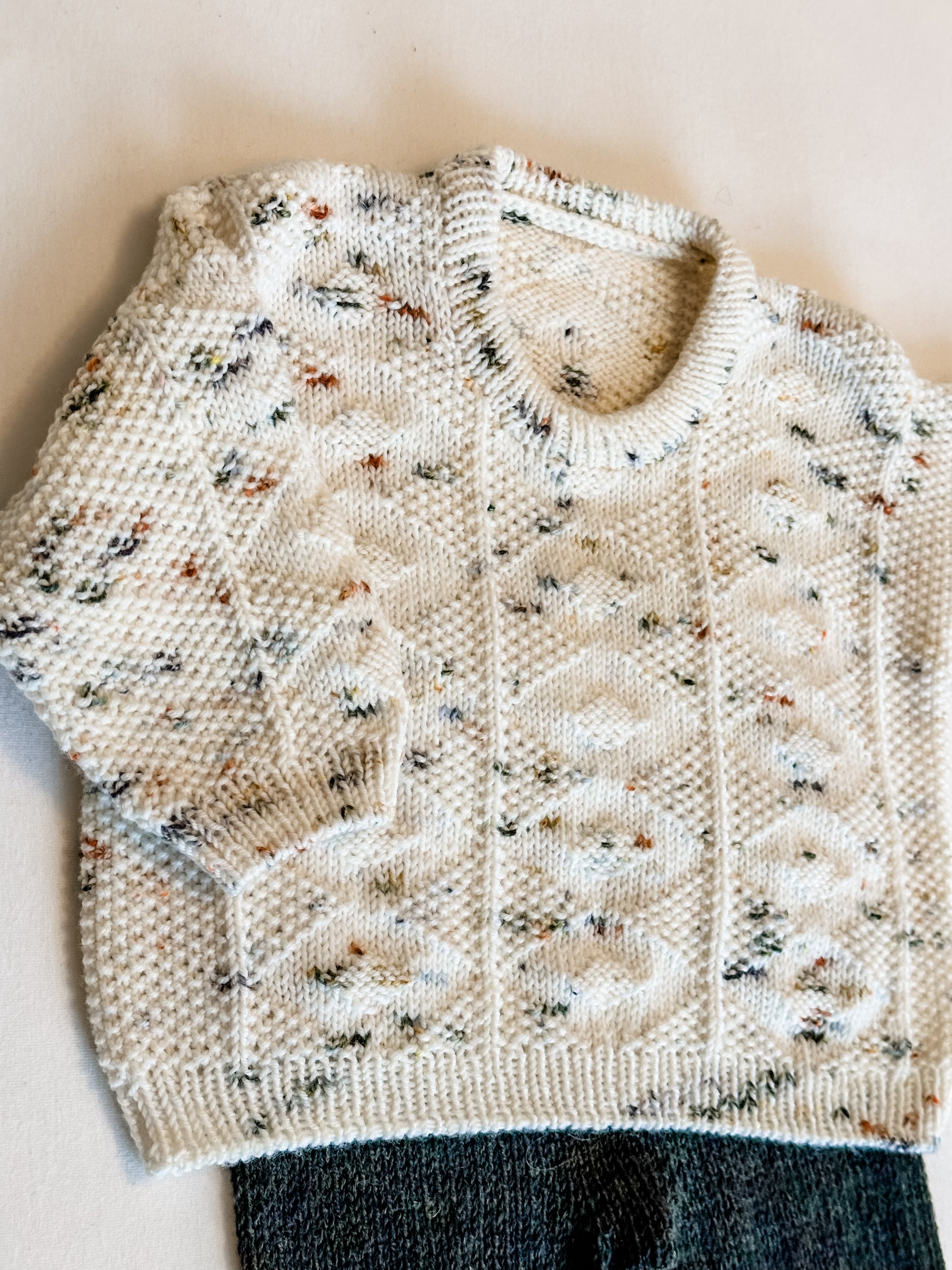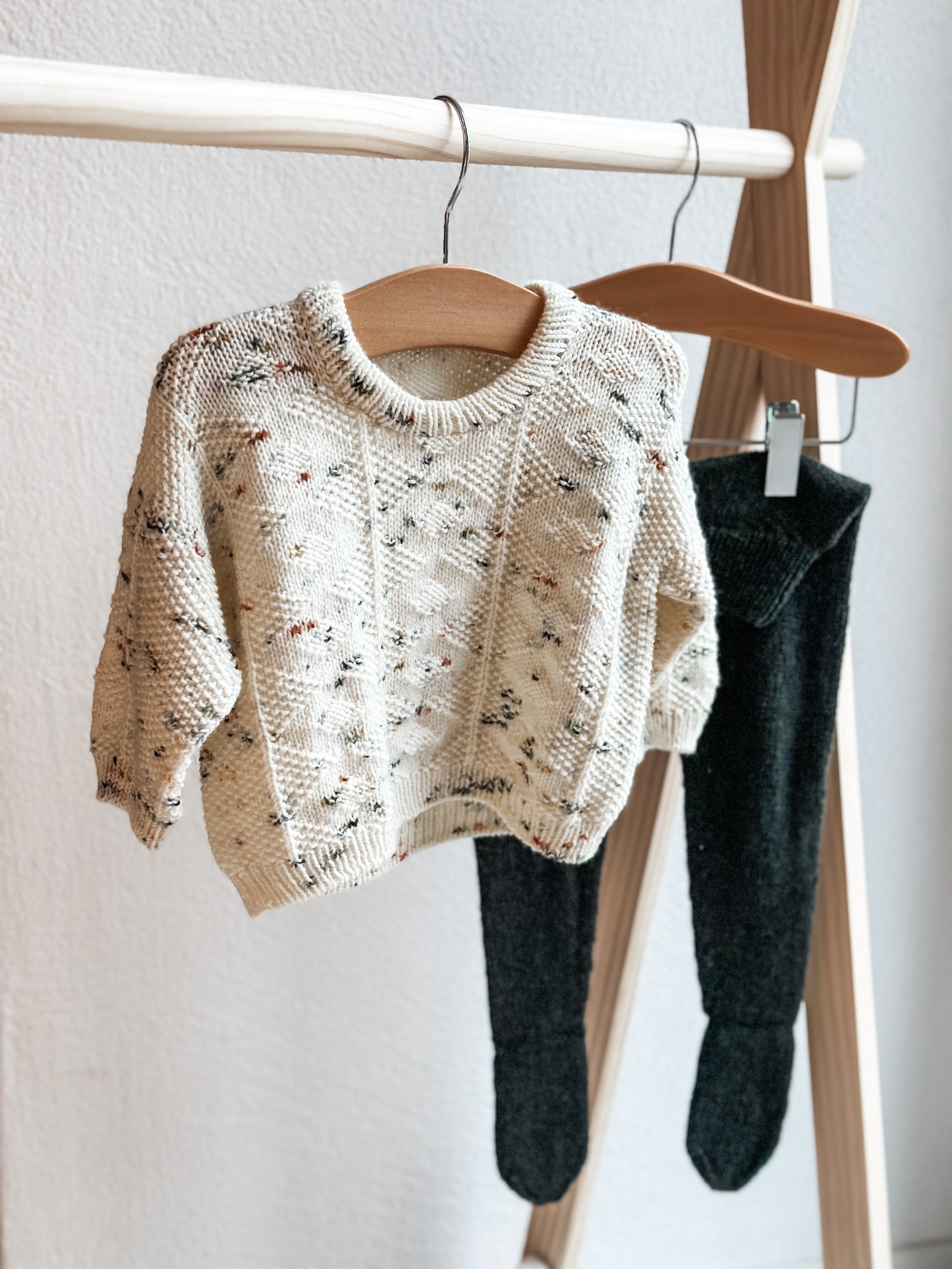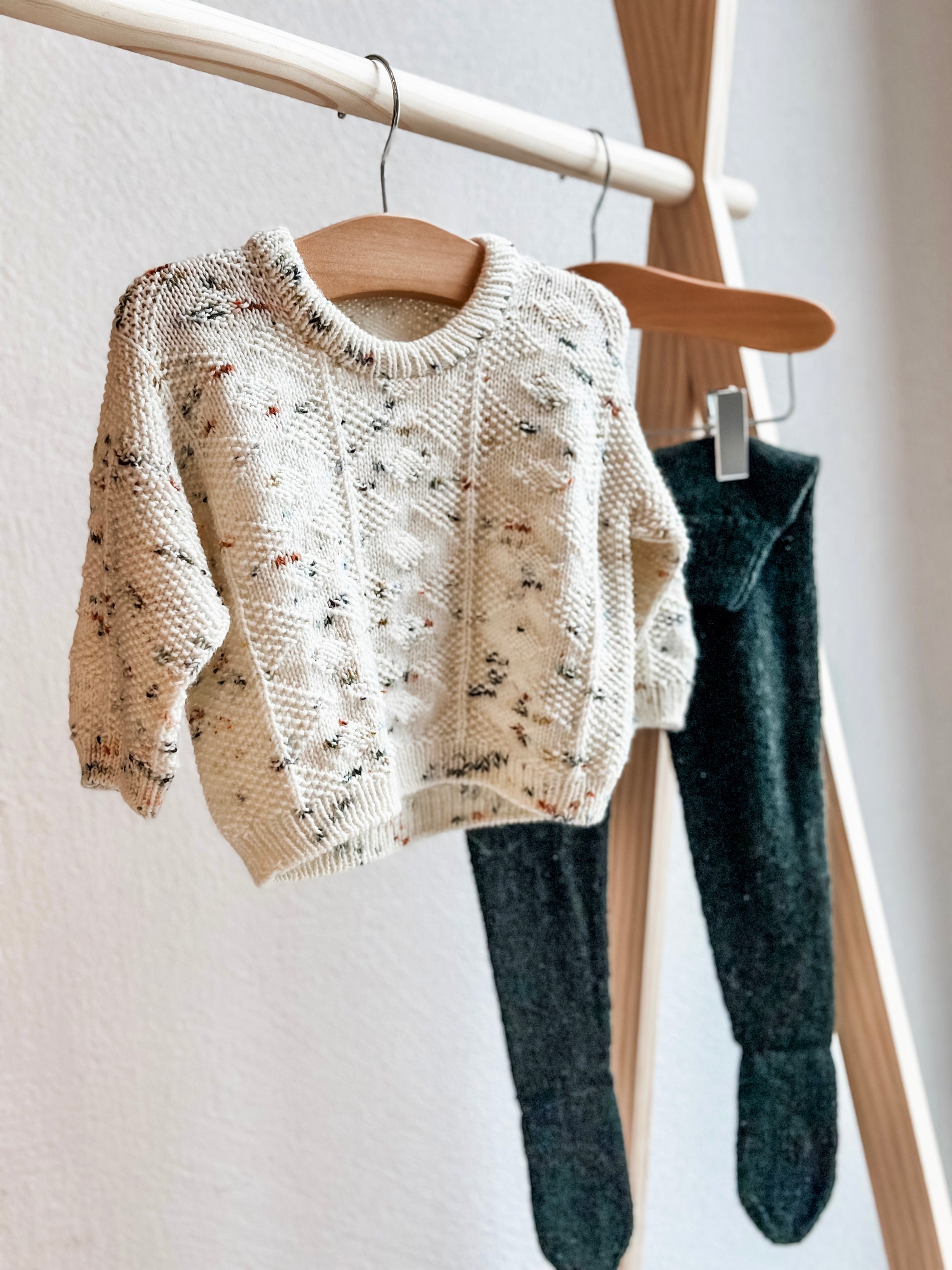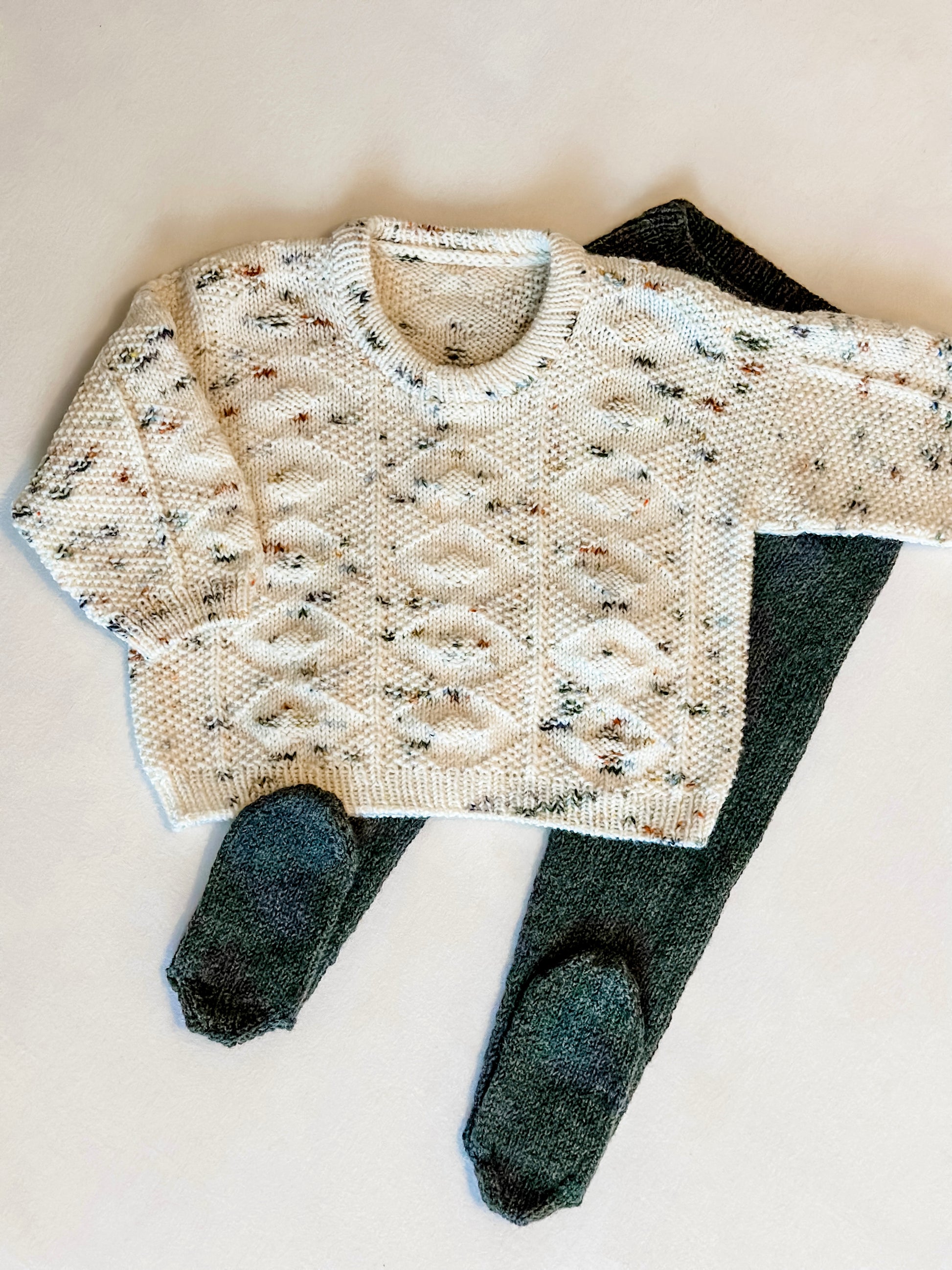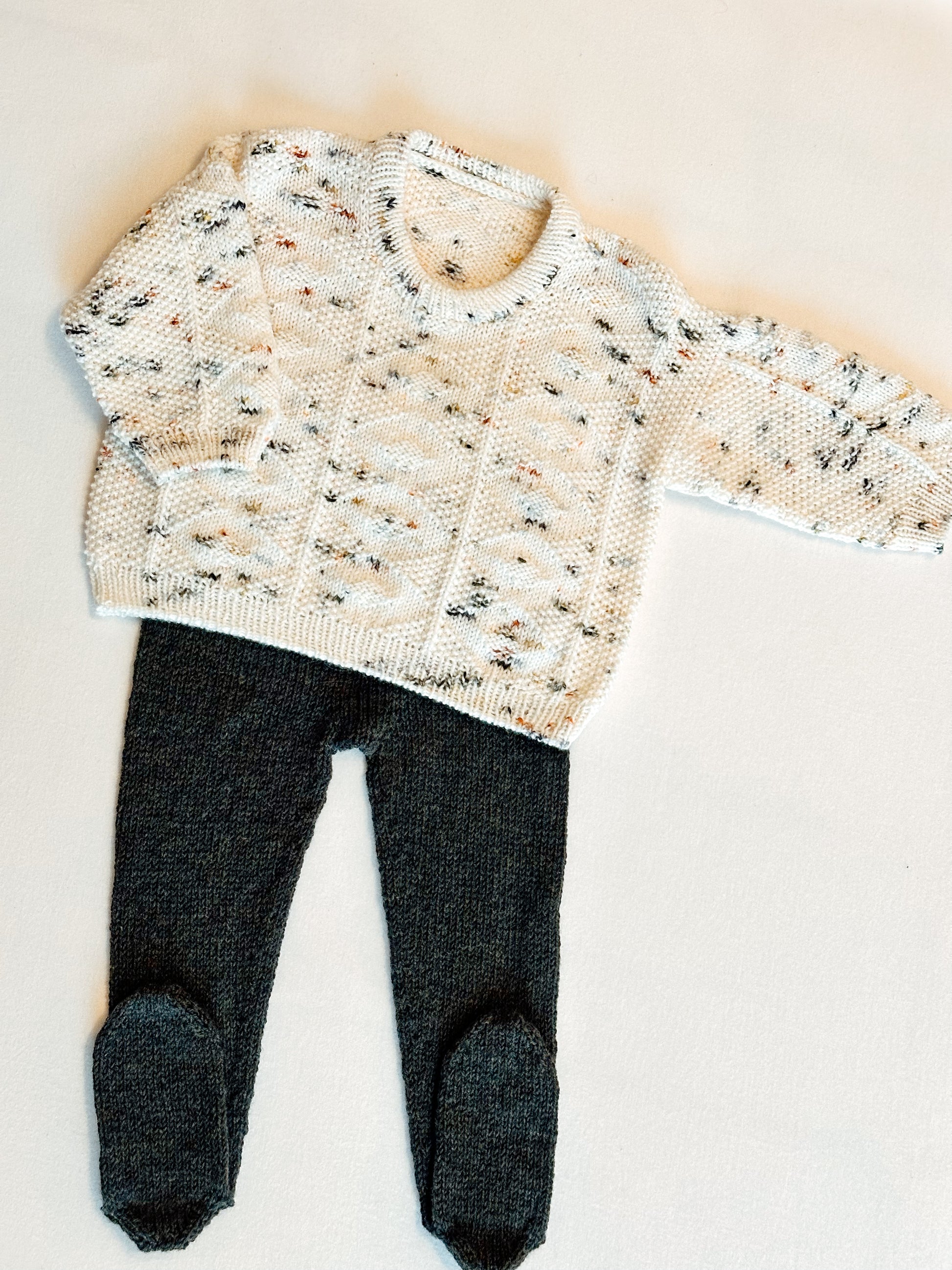 Dieses handgestrickte Set aus Pullover und Strumpfhose ist ein wahrer Wohlfühltraum für die Kleinsten und ein echter Hingucker! Der weiße Pullover besticht durch sein dezentes Perlmuster, das von fröhlichen, grünen und orangen Farbtupfern durchbrochen wird – perfekt, um dem Herbst- und Frühlingswetter Farbe zu verleihen. Die Mischung aus weicher Merinowolle und robustem Nylon sorgt für eine angenehme Tragequalität und macht den Pullover zugleich besonders langlebig und widerstandsfähig.