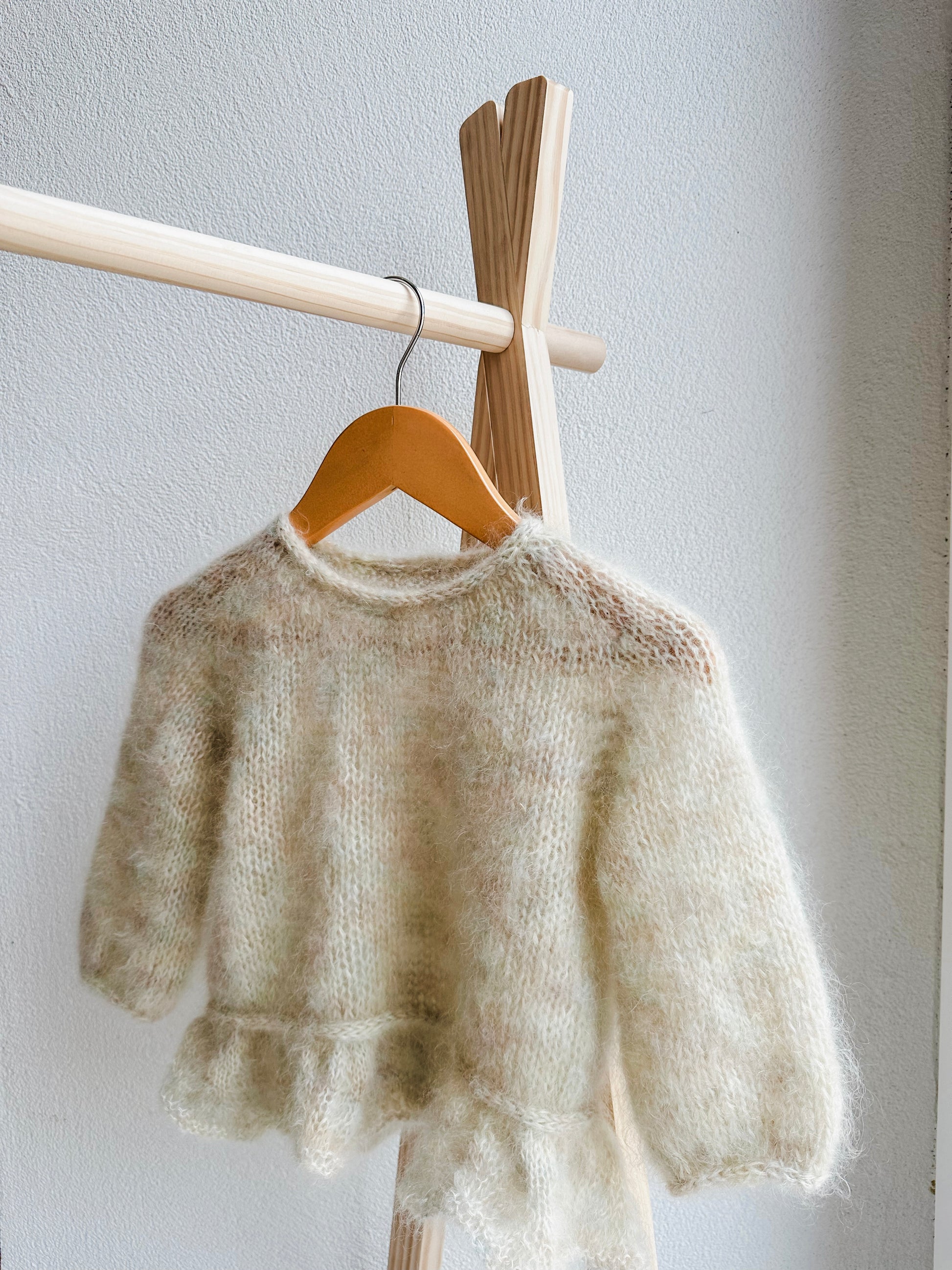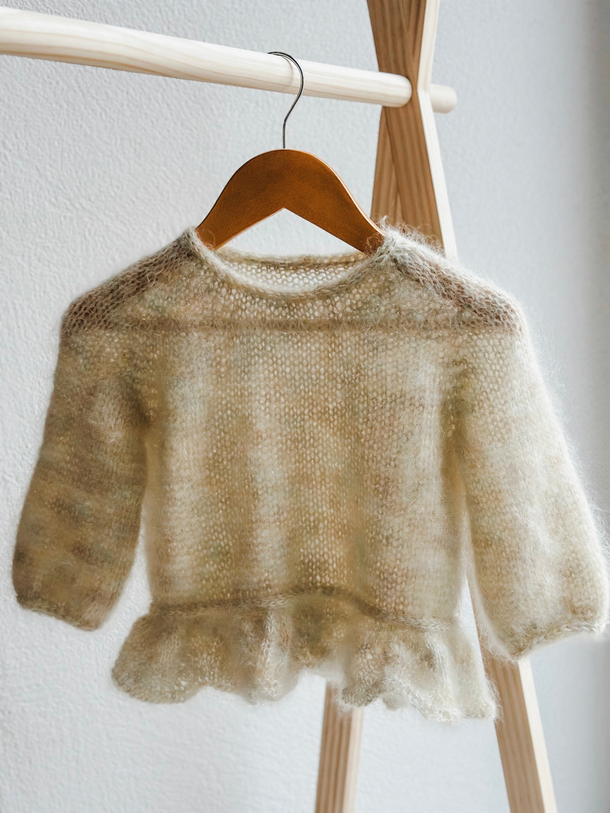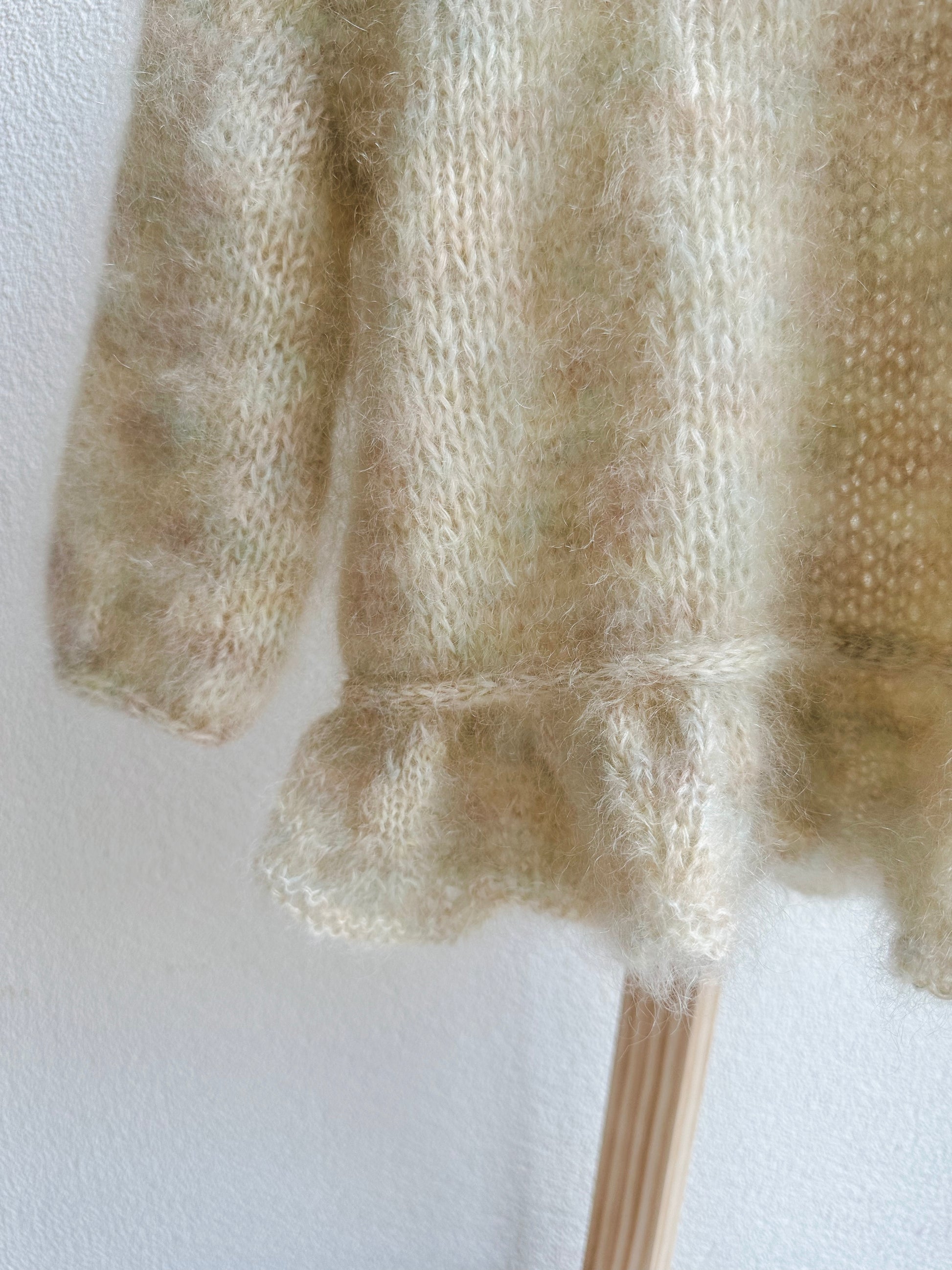 Dieser handgestrickte Pullover ist aus flauschiger Mohair-Seide-Mischung gefertigt. Er ist ein universeller Alltagsbegleiter, der durch seine zarten Farben für gute Laune sorgt. Der Rüschensaum verleiht ihm das gewisse Extra und macht ihn zum Hingucker. Perfekt für alle, die es unkompliziert und trotzdem besonders mögen!